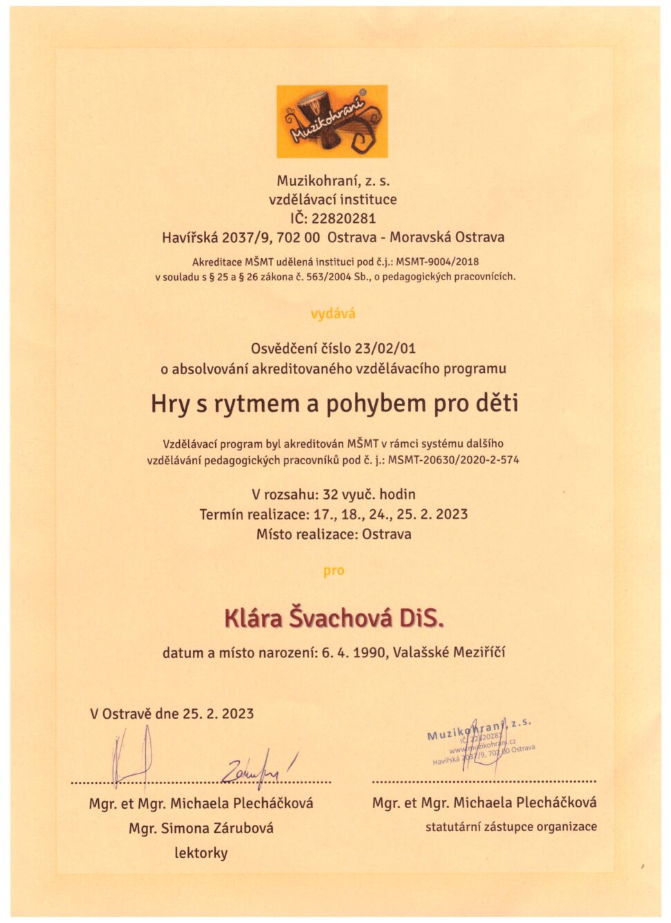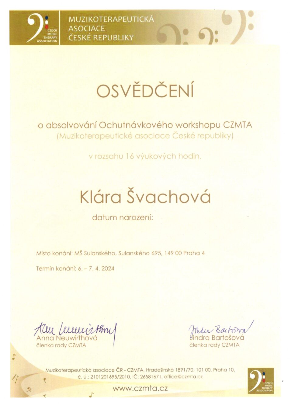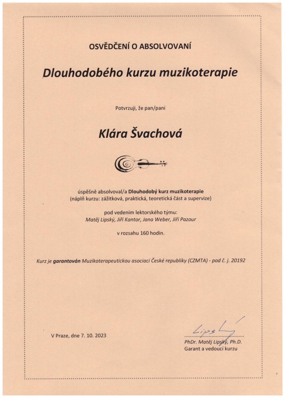 Před lety mě začaly zajímat i terapeutické účinky hudby. Absolvovala jsem proto Dlouhodobý kurz muzikoterapie u Matěje Lipského v Praze. V současné době navštěvuji kurz Hudební kreativita u Anny Neuwirthové na Fakultě umění v Ostravě.